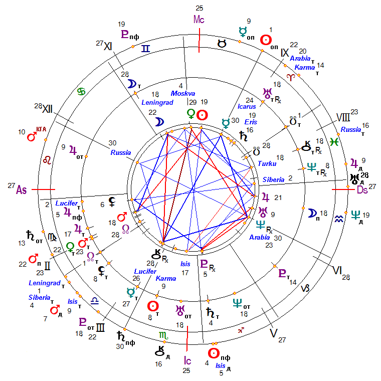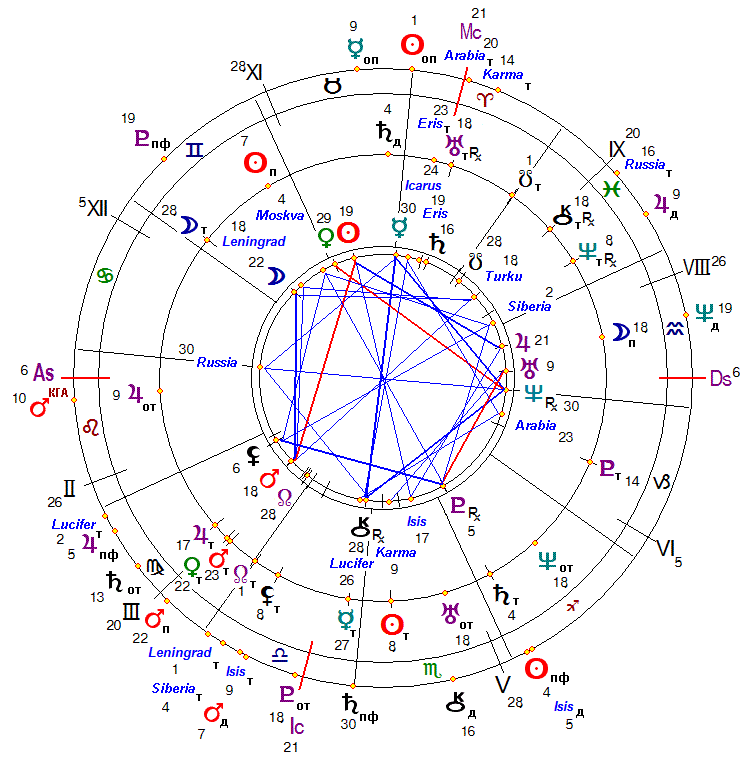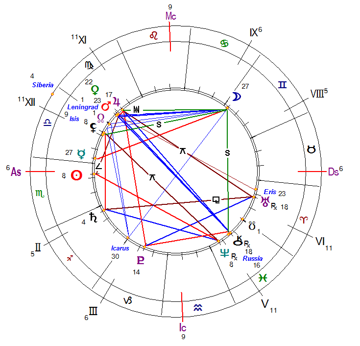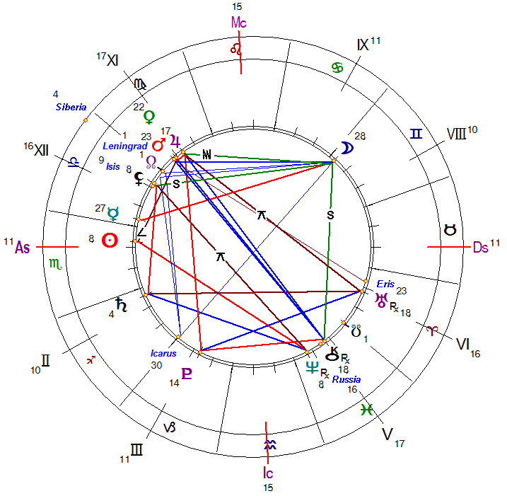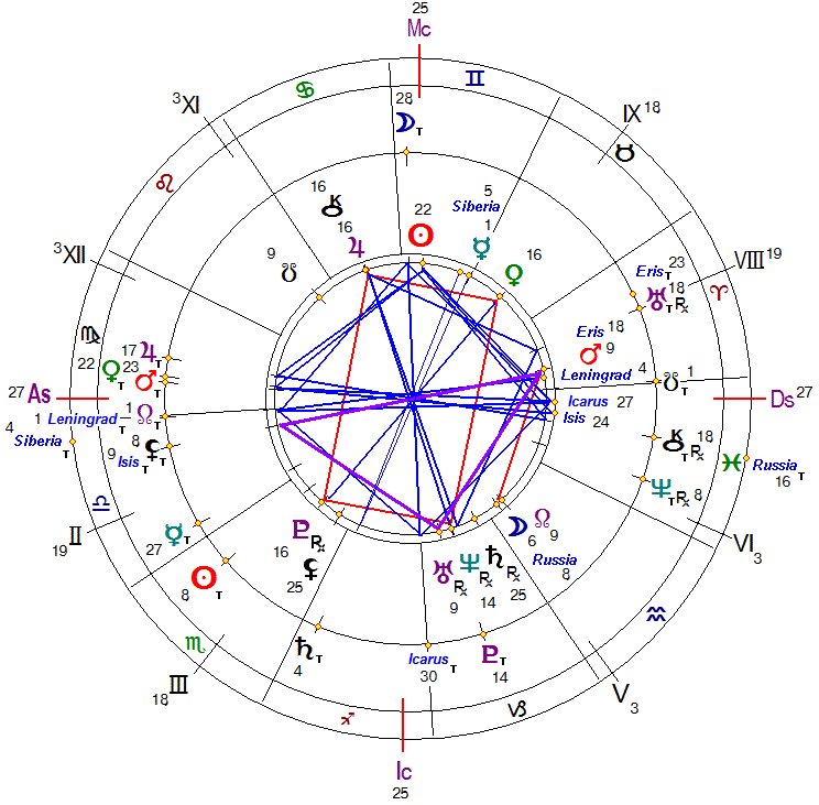 Это становится еще более очевидным, если учесть квадраты транзитного астероида Icarus (падение с высоты и гибель) в 29°50 Стрельца в 4 Доме земель, территорий и аэропортов РФ с транзитными астероидами Leningrad (Ленинград/Санкт-Петербург) и Siberia (Сибирь) в 0°28 и 3°51 Весов в 1 Доме и с радиксными астероидами Icarus (падение с высоты и гибель) и Leningrad (Ленинград/Санкт-Петербург) РФ в 26°24 Рыб и 3°49 Овна в 7 Доме, что привело к созданию Тау-квадрата. С учетом транзитной Луны (эмоции, психика, пассажиры, «спусковой крючок» трагедии) в 27°10 Близнецов в 10 Доме эта конфигурация превращается в Большой квадрат.