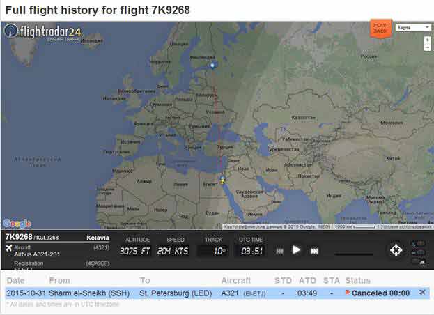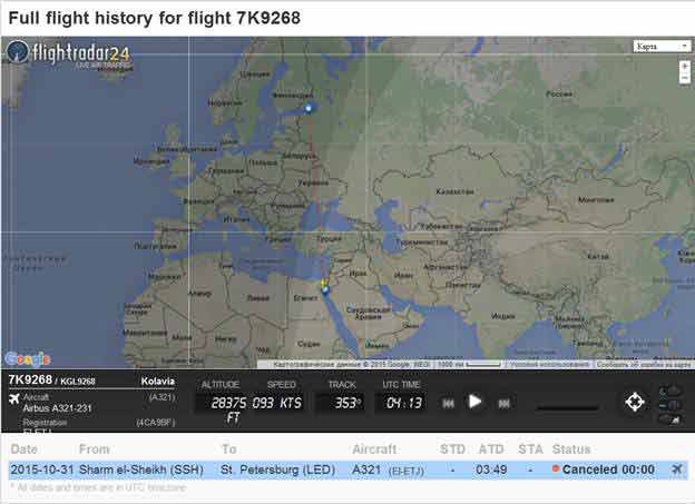 Очередная авиационная трагедия случилась с самолетом Airbus A321 EI-ETJ авиакомпании «Когалымавиа» (торговая марка Metrojet), выполнявшим чартерный рейс 7К 9268 Шарм-эш-Шейх — Санкт-Петербург. Согласно данным сайта Flightradar24, самолет вылетел из аэропорта Шарм-эш-Шейх (координаты: 27°58′43″ N; 34°23′37″ E) в 3:49 UTC (5:49 LMT) 31 октября 2015 года.