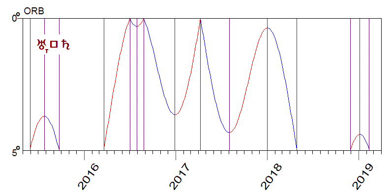 Как видно из рис. 4, квадрат транзитного Урана к радиксному Сатурну будет непрерывным с 20.03.2016 г. по 30.04.2018 г., а затем повторится с 28.11.2018 по 12.02.2019 г. Точными значениями этого аспекта будут 02.07 и 26.08.2016, 9.04.2017 и 30.04.2018 г. Вот, уж где достанется обветшавшим зданиям, инфраструктуре и ЖКХ в целом!