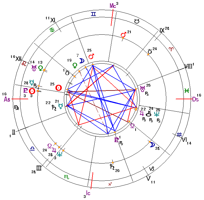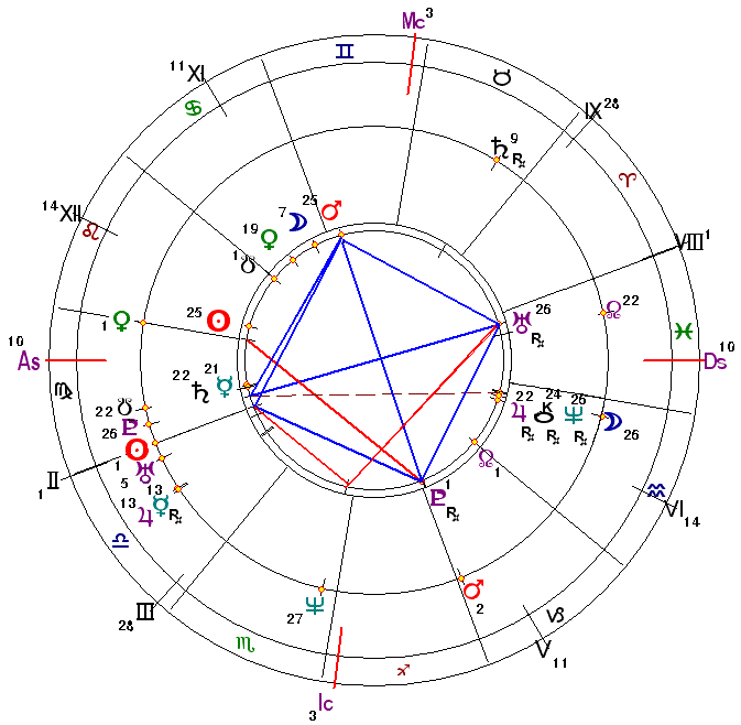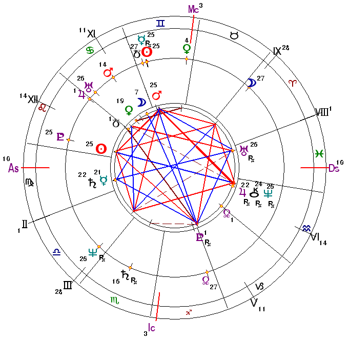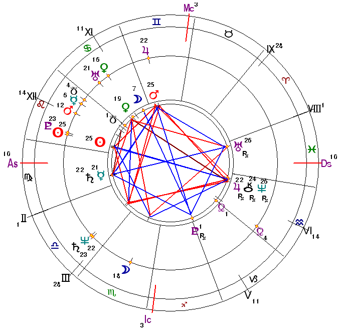 В дополнение к этой конфигурации Марс (активность) Неволько в 11°52 горделивого Льва в 11 Доме друзей по идеалам в соединении с куспидом 12 Дома несчастий в 13°25 Льва тоже свидетельствует о трагическом исходе (12 Дом) праздничного (Лев) мероприятия с приглашенными друзьями (11 Дом).