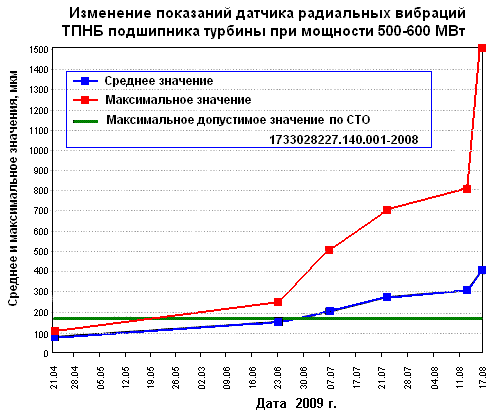 Рис. 35. График радиальных вибраций турбинного подшипника со стороны нижнего бьефа для ГА № 2