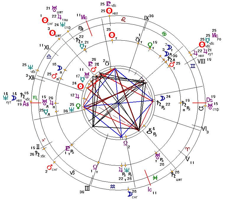 С другой стороны, эта авария вскрыла порочность реформ Чубайса в энергетике, нанесла прямой удар (Марс) по самим идеям (Меркурий) либеральной экономики, столь рьяно насаждаемым (Солнце) Чубайсом в такой сложной технологической отрасли как электроэнергетика. О таком разрушительном характере действий Чубайса свидетельствуют и другие синастрические аспекты на рис. 39, в частности, точное соединение его Плутона в 24°41 Льва с Солнцем Неволько и Солнцем аварии в 24°02 и 24°15 Льва в 9 Доме идеологии. Вновь властное давление (Плутон, Лев) Чубайса в реализации своей идеологии (9 Дом) в реформе электроэнергетики, оказываемое на финансиста и директора (Солнце) СШ ГЭС Неволько, привело к аварии (Солнце) на станции, поскольку Солнце аварии входит в другой Большой квадрат, затрагивающий ось Асцендент–Десцендент.