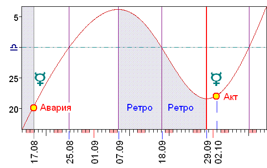 Кроме того, и движение по небосводу самого Меркурия тоже тесно связано с задержкой публикации отчета Ростехнадзора. Так, на рис. 40, где приведен график движения Меркурия в период от момента, предшествующего аварии, до момента публикации акта Ростехнадзора, видно, что до 7 сентября Меркурий двигался директно, постепенно уменьшая свою скорость. 7 сентября Меркурий стал статическим и затем вплоть до 29 сентября двигался ретроградно, т.е. попятно. Поэтому все действия, связанные с написанием, опубликованием документов, в этот период были по астрологическим причинам заторможены. 29 сентября 2009 года Меркурий вновь стал статическим и начал двигаться директно, прямо, постепенно набирая скорость. В самом начале этого директного движения, т.е. 2 октября, Ростехнадзор озвучил и опубликовал свой доклад о техническом расследовании причин аварии на СШ ГЭС.
