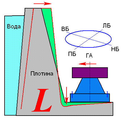 Случай горизонтальных упругих деформаций плотины в ее верхней части из-за большого уровня и напора воды, ведущим к вертикальным перемещениям в нижней, станционной части плотины (рис. 41), рассматривался участниками Интернета-форума автомобилистов Хакассии “Авария на СШ ГЭС” (http://forums.drom.ru/hakasiya/t1151239745). В терминологии участников данного форума такой случай назывался “L-вариант” из-за сходства плотины с буквой “L”.