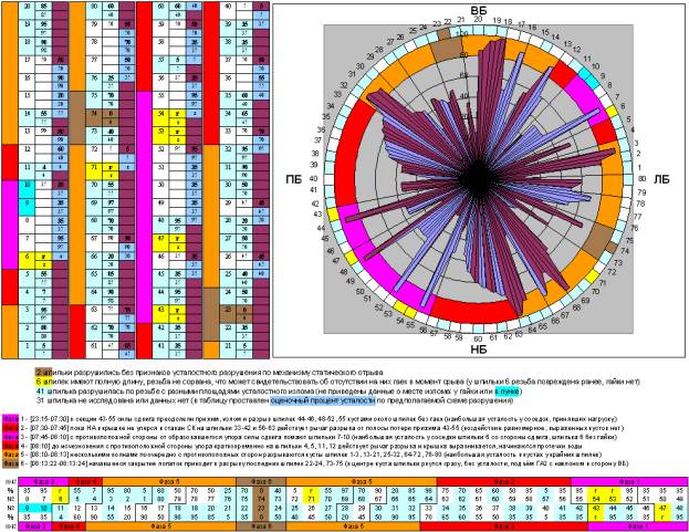 Шпильки, выделенные коричневым цветом, разрушились без признаков усталостного разрушения по механизму статического отрыва; у шпилек, выделенных желтым цветом, имеют полную длину, резьба у них не нарушена, что может свидетельствовать об отсутствии на них гаек. Еще 41 шпилька, которые выделены голубым цветом, разрушились по резьбе с разными площадями усталостного излома. У выделенных белым цветом 31 шпильки данные о разрушении в акте отсутствуют, для них приведены оценочные проценты усталости по предполагаемой схеме разрушения.