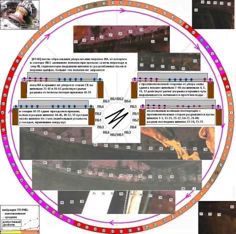 Интересен вопрос, почему так долго не был опубликован акт технического расследования аварии, несмотря на то, что он был готов в своей основной части уже 9 сентября 2009 года. Ответ можно найти, обратившись к карте аварии, приведенной на рис. 2 и для удобства рассмотрения повторенной еще раз в данной части статьи.