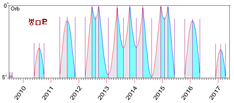 Таковы основные сведения о предстоящей в ближайшее время работе на СШ ГЭС. Проводится эта работа будет в непростой астрологической обстановке. В первую очередь, это относится к квадрату транзитных Урана и Плутона, динамика которых при орбисе 5° приведена на рис. 44.