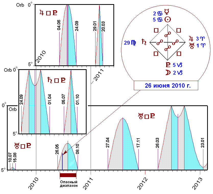 Если учесть, что в летне-осенний период, с 4.06 по 24.09.2010 г., Юпитер и Уран в начале Овна, Сатурн в конце Девы — начале Весов и Плутон в первых пяти градусах Козерога сформируют Тау-квадрат, то опасность для СШ ГЭС и ее плотины будет очень и очень большой. Этот период на рис. 45 прямо выделен как “опасный”. Временами действие этого Тау-квадрата будет усиливаться подключением к нему других быстрых транзитных планет. Так, 24-26 июня 2010 года транзитное Солнце и Меркурий будут находиться в оппозиции с Плутоном и в квадратах к Сатурну и Юпитеру с Ураном, образуя вместе с ними Большой квадрат. А 26 июня к этой конфигурации присоединится и транзитная Луна, являющаяся обычно вместе с Меркурием “пусковым” фактором и включающая в действие Большой квадрат (тем более что в этот день произойдет полнолуние с лунным затмением, дополнительно усиливающим проявление человеческого, техногенного фактора и природных аномалий и катаклизмов — в дни полнолуний земная кора и жидкости испытывают на Земле наибольшие приливные воздействия). Потому на рис. 45 в правом верхнем углу дата 26.06.2010 г. выделена особо с указанием положения планет в знаках Зодиака.