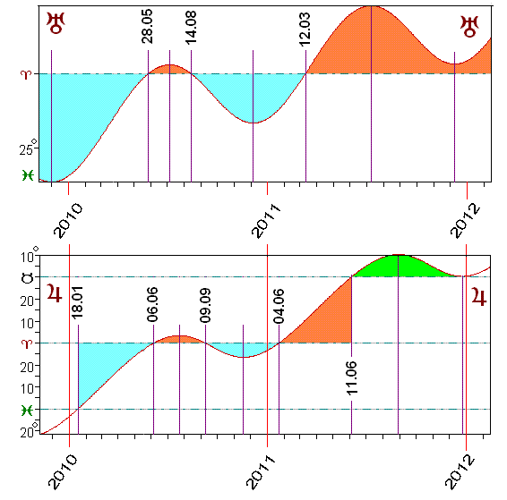 В дополнении к Урану в оппозицию к Марсу и Плутону СШ ГЭС в 2010 и 2011 годах встанет и транзитный Юпитер. Для Марса станции это произойдет в периоды с 27.04 по 05.07.2010 г. и с 10.08.2010 г. по 15.02.2011 г.; для Плутона ГЭС — с 28.04 по 11.07.2010 г. и с 04.08.2010 г. по 08.02.2011 г. Юпитер в астрологии отвечает за изобилие, расширение, потому в водном знаке Рыб он даст обилие воды, как во вне плотины, так и в самом теле плотины, а в огненном знаке Овна — обилие пожаров и гроз, повышение температуры, активности, подвижности и импульсивности. Для СШ ГЭС наибольшую опасность представляет водная стихия, потому важно знать периоды, когда транзитные Уран и Юпитер будут образовывать оппозицию к Марсу и Плутону СШ ГЭС, находясь в Рыбах. Динамика прохождения этих планет по знакам Зодиака в 2009-2012 годах приведена на рис. 46.