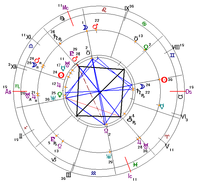 Второй Большой квадрат образован транзитным Нептуном в 28°41 Водолея в 3 Доме коммуникаций, натальной Луной и транзитным Солнцем в 23°48 и 29°51 Тельца в 7 Доме, транзитной Луной в 0°01 Девы в 9 Доме, натальными Венерой и Нептуном в 24°58 и 29°18 Скорпиона в 1 Доме. К этому Большому квадрату через аспекты к натальным Венере и Луне станции присоединяется Тау-квадрат, состоящий из транзитного Марса в 21°22 Льва в 9 Доме; Асцендента, дирекционного Урана и прогрессивного Юпитера в 1 Доме в 18°41, 19°41 и 20°05 Скорпиона; Десцендента, натальных Сатурна и Луны в 7 Доме в 18°41, 21°06 и 23°48 Тельца.