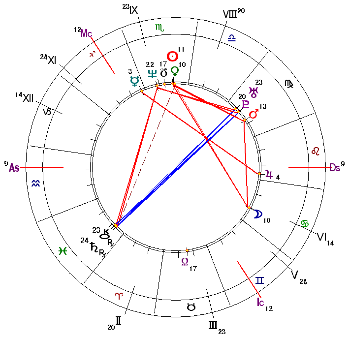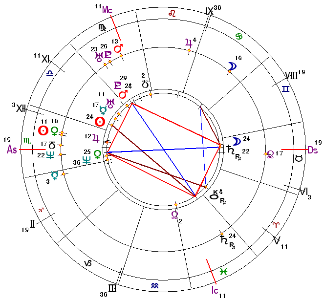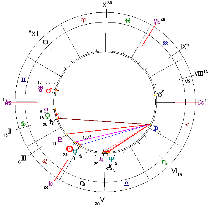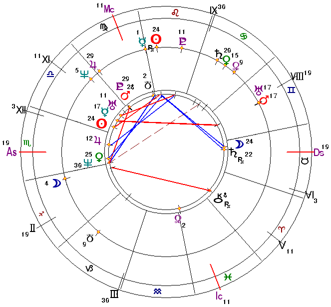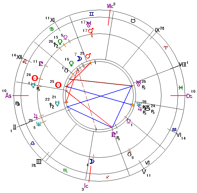 В этот день Марс и Уран находились в соединении в 17° Близнецов и с полуночи находились в 1 Доме вблизи Асцендента. В половине первого часа ночи Марс и Уран оказались в точном соединении с Асцендентом в 17° Близнецов. В предполагаемое время рождения в 0:55 Асцендент переместился в 24° Близнецов, т.е. Марс и Уран оказались в зоне Гоклена ± 12° от Асцендента. В результате такого положения планет у новорожденного возникла сильная контрактура (Уран) мышц (Марс) грудной клетки ребенка и он не мог дышать (Близнецы).