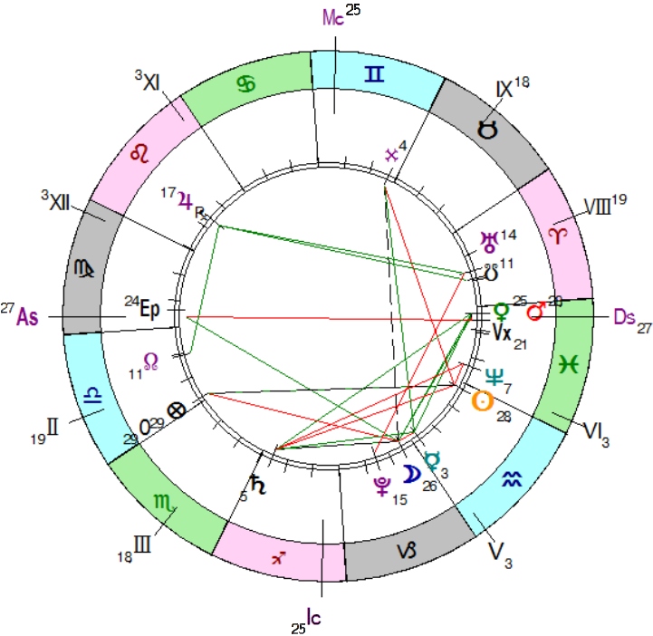 Асцендент карты в знаке Девы, управитель Меркурий стоит в Водолее на куспиде 5 Дома эстетики и красоты, находится в терме диспозитора Луны — Сатурна: кверент как медицинский работник хочет выглядеть достойно и готов претерпеть существенные изменения.