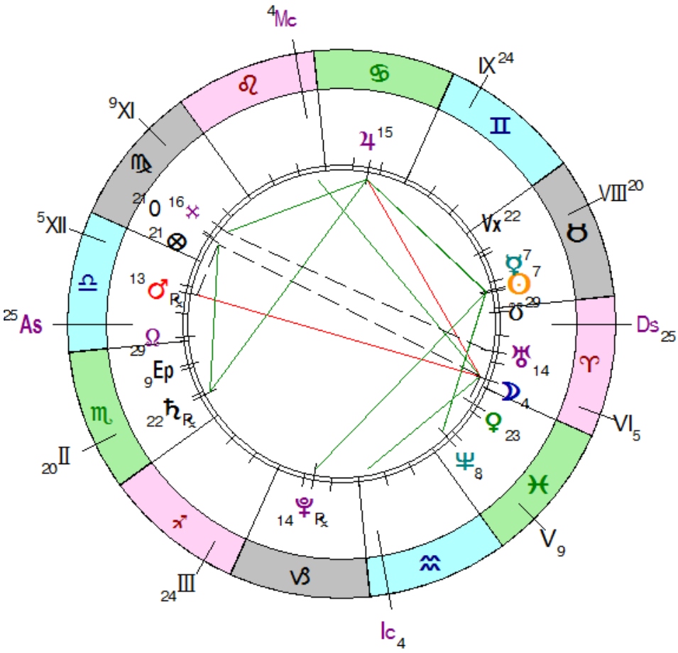 Кверент характеризуется Асцендентом и его управителем. Асцендент в Весах, Венера в знаке своей экзальтации в Рыбах. Что совершенным образом описывает девушку как привлекательную, даже несколько чрезмерно имеющую амбиции по типу «экзальтированности» и с большим потенциалом.