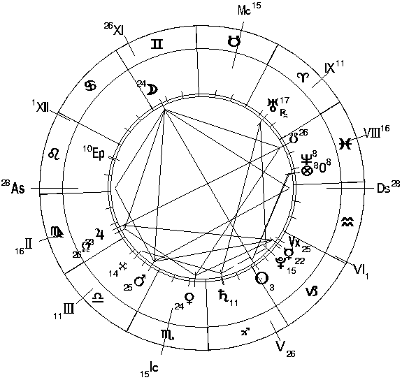 Данный вопрос можно рассматривать как по прямой карте, отдав беременной дочери 1 Дом, так как личность обозначена, так и по производной. При этом производную карту целесообразно построить как на 5 Дом, памятуя о том, что мама спрашивает о своем взрослом ребенке, так и с учетом 1 и 9 Домов, так как будущая бабушка интересуется судьбой собственного внука. Ответить на вопрос, «какой подход более правилен и логичен?», не представляется возможным. В данном случае имеет смысл проверить указания всех трех полученных карт на предмет соответствия.