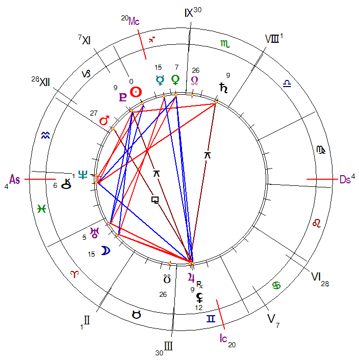 Вновь видим, что планеты Солнечной системы разбросаны почти по всему Зодиаку. Лишь Земля в 0°00 Рака, Луна в 29°51 Близнецов и Солнце в центре карты находятся на одной прямой, направленной на 0°00 Козерога.