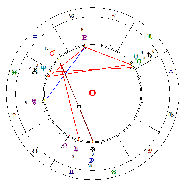 Соединение Нептуна (мистика, духовность, тайны, неясности, обман, иллюзии) и Хирон (странности, двойственности) в 0°49 и 5°38 размытых и таинственных Рыб с Асцендентом (внешние проявления) в 3°03 Рыб показывает, что в этот момент могут произойти как странные, неясные и таинственно-мистические события, так и прямая ложь, обман ожиданий человечества. Ситуация усугубляется квадратами Хирона с Венерой (чувства, увлечения, социум) в 6°35 пламенно-верующего Стрельца в 9 Доме веры и с ретроградным Юпитером (вера, мораль, масштабность событий) в 8°54 Близнецов (где Юпитер в заточении и слаб) в 3 Доме коммуникаций и СМИ, которые формируют Тау-квадрат. Кроме того, Юпитер находится в соединении с Черной Луной (искушения, темные дела) в 11°07 Близнецов, в точном квиконсе (орбис 0°03) с Плутоном (глобальные перемены, массовость, роковая гибель, оккультные явления) в 8°57 Козерога в 11 Доме, точном квиконсе (орбис 0°14) с Сатурном (ограничения, препятствия, сжатие, холод, смерть) в 8°40 Скорпиона в 8 Доме психологических кризисов и смерти.