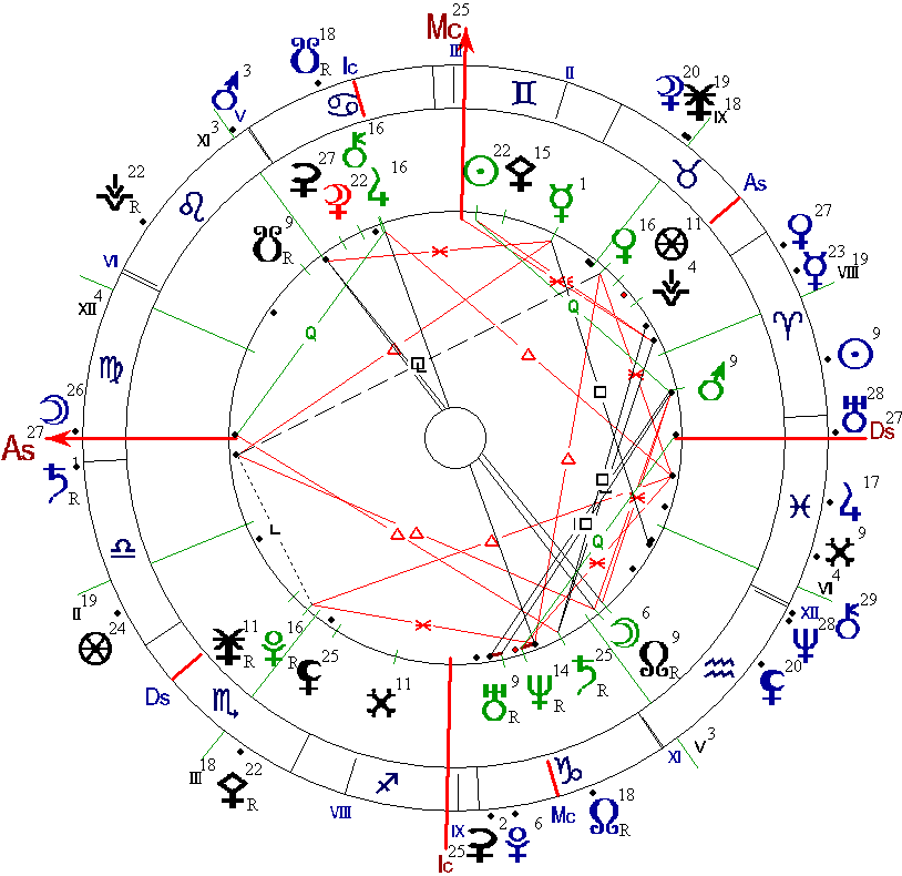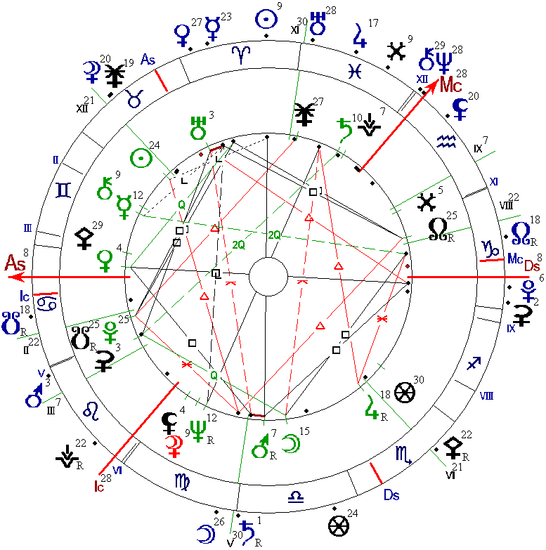 Карта России с наложением на нее карты теракта (рис. 1) сразу обращает на себя внимание тем, что она отягощена длительным и мощнейшим влиянием дальних планет: транзитный Уран расположился на Десценденте карты России, а в оппозиции к нему на Асценденте – Сатурн с подоспевшей к нему в момент теракта Луной, выполнившей роль спускового механизма. При этом указанные планеты образуют еще и квадратуру к оси MC-IC.