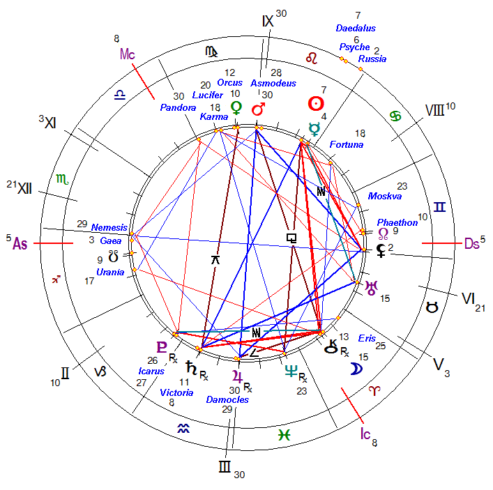 В свою очередь, астероид Pandora (Пандора с ящиком бед) и Черная Луна (соблазны, темные дела) в 5°19 и 7°55 Скорпиона в 9 Доме идеологии и дальних планов, где рядом находится астероид Urania (Урания — муза астрономии и астрологии; неожиданности, бунтарство, Небеса, Космос) в 3°49 Скорпиона, образовали квадрат с астероидом Damocles и Ураном, а также бинонагон с астероидом Russia и Нептуном в 1 Доме.