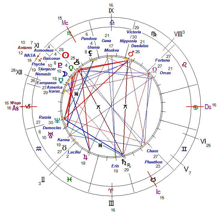 Споры-раздоры вносит и квадрат Плутона (разрушение) и астероида Icarus (Икар, упавший в море и разбившийся при падении) в 25°17 и 26°28 Козерога во 2 Доме с ТНО Eris (Эрида-Раздор) в 24°47 Овна в 4 Доме места нахождения модуля «Наука» в составе МКС.