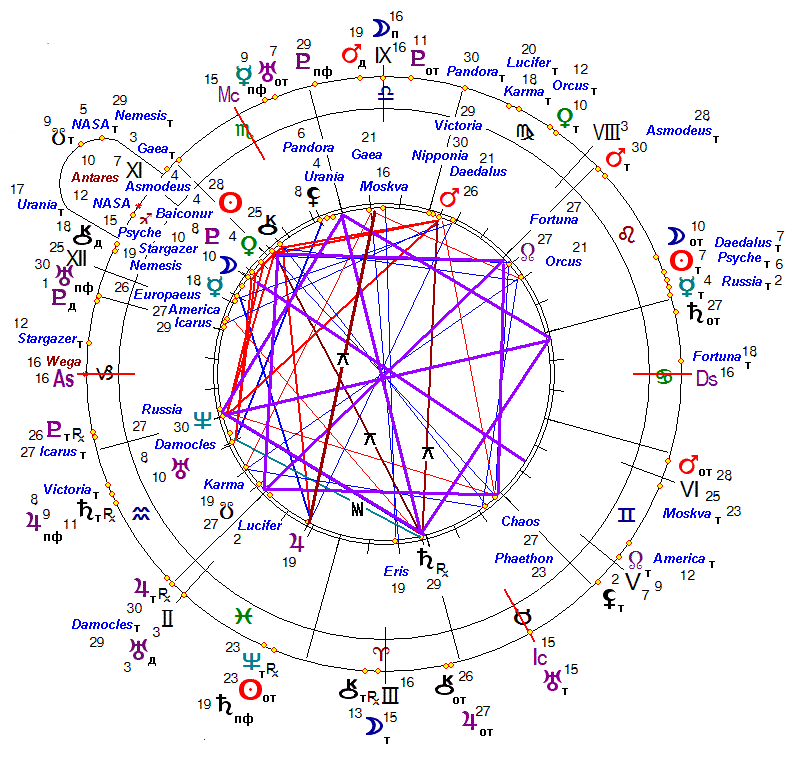 Особого внимания заслуживает ретроградный Нептун (тайны, неясности, коррупция, ложь, обман, топливо, газ) в 22°54 Рыб в 3 Доме близкого окружения, контактов, встреч. Он находится в оппозиции с астероидами Karma (Карма) и Lucifer (дьявольские силы и козни) в 17°01 и 19°47 Девы в 9 Доме и в квадрате с астероидом Moskva (Москва) в 22°22 Близнецов в 7 Доме, образуя вместе с ними Тау-квадрат, указывающий на источник кармических инфернальных проблем модуля — Москву. Тем более, что Нептун оказывается в полутораквадрате с астероидом Psyche (Психея — душа, психика), Солнцем (воля, инициативы, руководство, власти) и астероидом Daedalus (Дедал — отец Икара, сделавший крылья для полета; символ творцов модуля «Наука») в 5°37 и 6°43 Льва в 8 Доме аварий и катастроф.