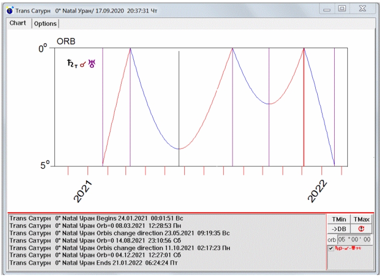 Динамика соединения транзитного Сатурна с радиксным Ураном МКС при орбисе 5° показана на рис. 4.