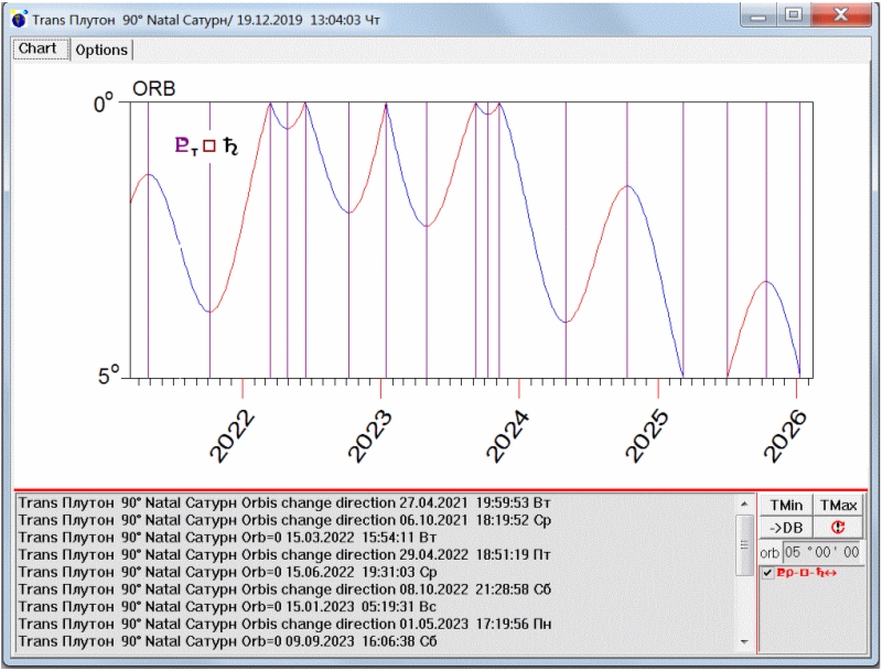 На рис. 5 показана динамика квадрата транзитного Плутона с радиксным Сатурном МКС в 2021-2026 годах при орбисе 5°.