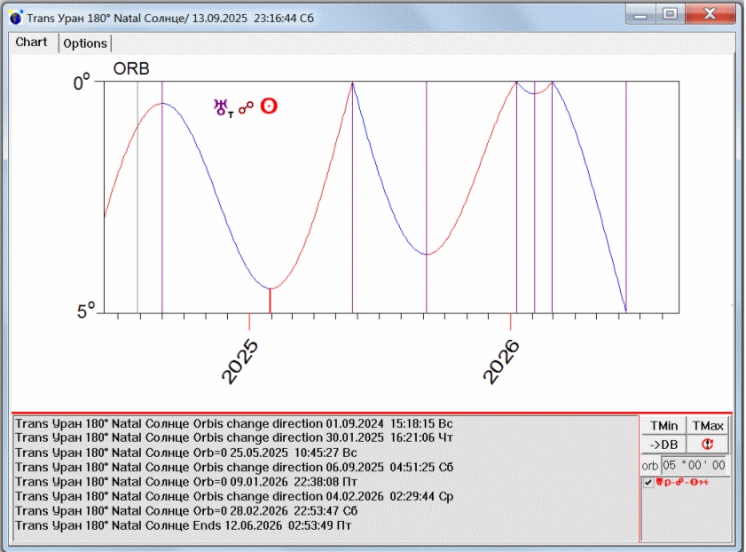 И, наконец, транзитный Уран (космонавтика, МКС) создаст в 2024-2026 годах оппозицию к радиксному Солнцу (руководство, власти) МКС в 27°44 Скорпиона в 10 Доме властей. Динамика этого аспекта при орбисе 5° приведена на рис. 6.