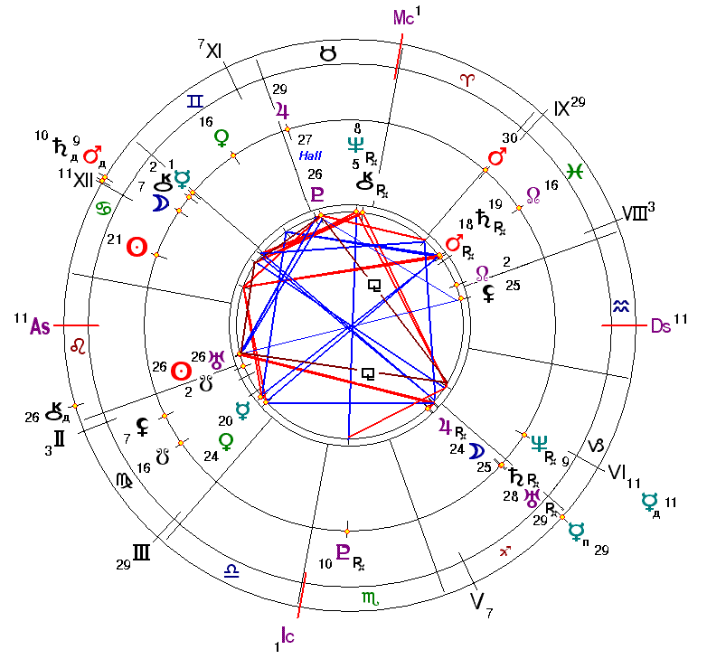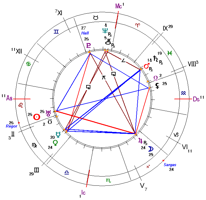 Перечисленные планеты образовали квадраты к Плутону (роковые и давящие обстоятельства, тотальное разрушение) открытия Фобоса в 25°31 Тельца в 10 Доме целей существования и создали мощный Тау-квадрат, еще больше вынуждавший руководителей проекта отправить АМС к Фобосу. К углам этого Тау-квадрата присоединились прогрессивный Уран (неожиданности, космонавтика) в 29°10 Льва в 1 Доме самовыражения, профекционные Марс (сама планета и ее спутник Фобос) и Сатурн (ограничения, препятствия, долг) в 24°35 и 25°19 Тельца в 10 Доме целей, прогрессивная Венера (оценка ситуаций) в 24°49 Водолея в 7 Доме оппонентов.