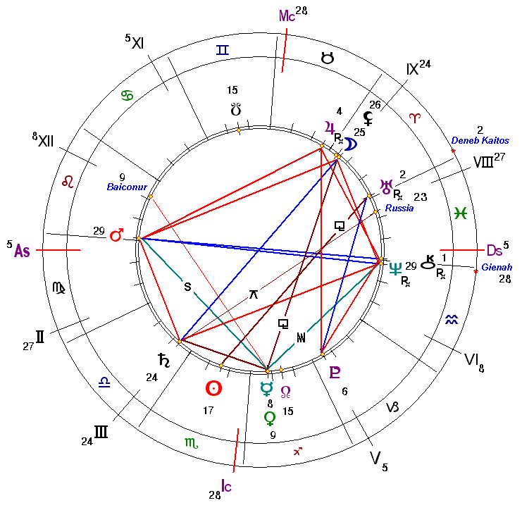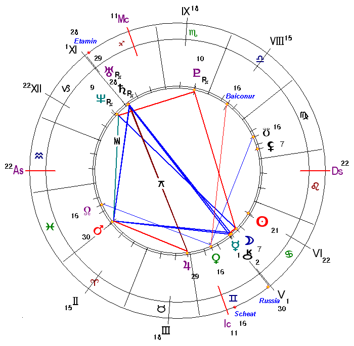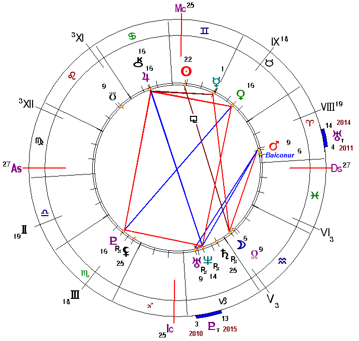 Наконец еще один Тау-квадрат образовали: а) профекционный Нептун (неясности, размытость, растворение, море-океан), транзитные астероиды Baikonur и Russia в 26°46, 27°40 и28°01 водного знака Рака в 10 Доме властей; б) транзитные Венера (управитель 9 Дома дальних полетов в Тельце) и Хирон (странные и трудно диагностируемые отказы и сбои) в 22°22 и 25°11 Весов во 2 Доме оборудования, аппаратуры и материальных ресурсов; г) радиксный Сатурн (ограничения, регламент, дисциплина, безопасность), транзитный Нептун (размытость, неясности), профекционные Юпитер (большие финансы и интересы) и Хирон (двусмысленности и странности) в 24°13, 25°27, 28°12 и 28°44 Козерога в 4 Доме стартовых площадок, территорий и земель, конца дел.
