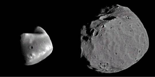Изображения Фобоса и Деймоса показывают, что оба они имеют неправильную форму, которая может быть аппроксимирована эллипсоидом, размеры которого для Фобоса составляют 13,3 ´ 11,1 ´ 9,3 км, для Деймоса — 7,5 ´ 6,2 ´ 5,2 км.