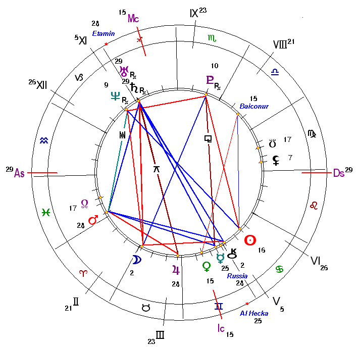 Эта потеря КА нанесла удар и по космодрому «Байконур», так как транзитный Сатурн (ограничения, трудности) в 0°51 импульсивного Овна оказался в соединении с радиксными астероидами Baikonur (космодром) и в 5°44 Овна в 7 Доме, а ограничивающий и сдерживающий транзитный Южный Узел Луны в 6°51 Овна — в соединении с управителем 8 Дома в овне — радиксным Марсом в 8°49 Овна в 7 Доме.
