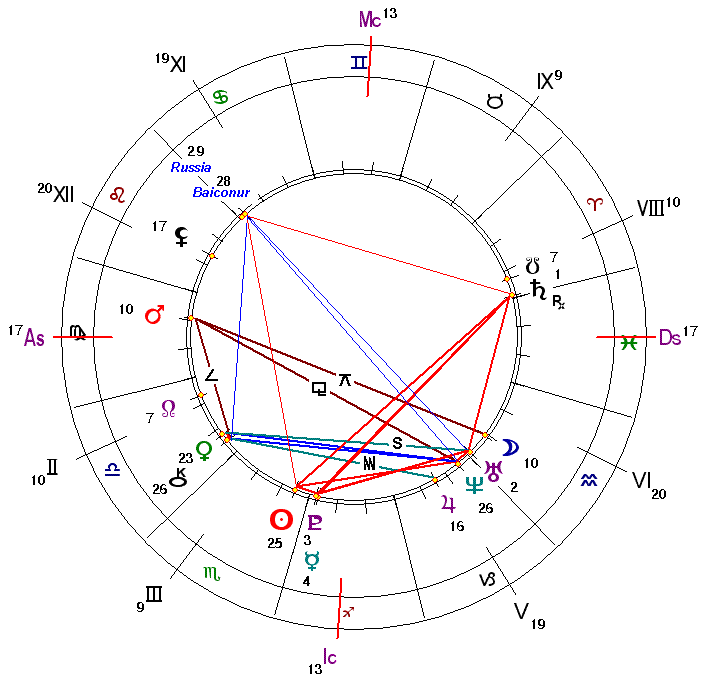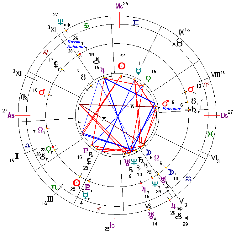 О неудачности выбора времени запуска ракеты с КА свидетельствует и оппозиция транзитных Плутона (роковые обстоятельства, полный крах и разрушение) и Меркурия (посланник к другой планете, средства связи и управления) в 2°40 и 3°22 вечно спешащего Стрельца в 3 Доме коммуникации и близких путешествий с радиксным Меркурием (решения, замыслы, расчеты) в 0°36 поверхностных Близнецов в 9 Доме идеологии, дальних путешествий и полетов.