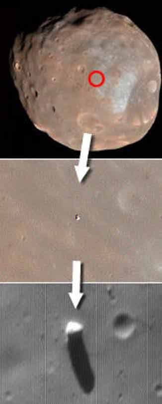 Перед тем, как замолкнуть, «Фобос-2» передал на Землю несколько странных изображений. Одно из них — фотография эллипсообразной «тени» на поверхности Марса. По официальной версии, тень отбрасывал сам Фобос. Однако некоторые специалисты отнеслись к этой версии весьма скептически, поскольку «тень» была видна и через инфракрасную камеру аппарата, регистрирующую тепловые объекты. А тень, по определению, не может быть теплой.