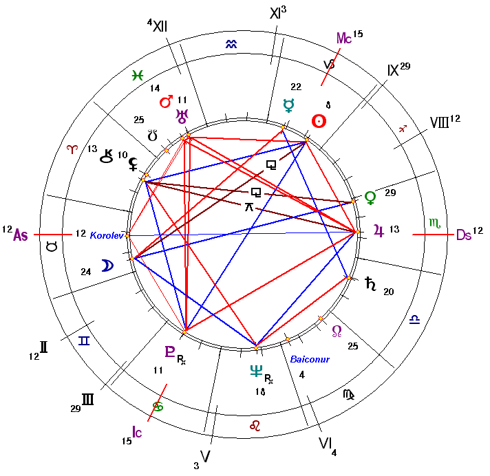 Интересно, что астероид № 1855 Korolev (Главный конструктор С.П. Королев) в 11°51 Тельца находится в точном соединении с Асцендентом СССР (лицо страны) в 11°29 Тельца и в секстилях с Ураном и Марсом (военная ракетно-космическая техника) в 12 доме изоляции и тайн, а также с Плутоном (атомное оружие) в 3 Доме близкого окружения. В результате, главные успехи советской космонавтики и ракетостроения были связаны с С.П. Королевым (астероид Korolev) и его сподвижниками. Однако и им не удалось осуществить удачные запуски КА к Марсу, поскольку планета Марс в карте находится в 12 Доме и является, по сути, тайным врагом (12 Дом) советской космонавтики (Уран). Да и ее целью было раскрытие тайн (12 Дом) планеты Марс.