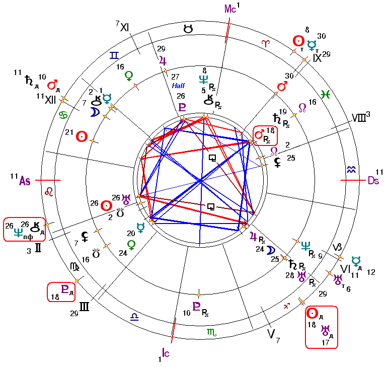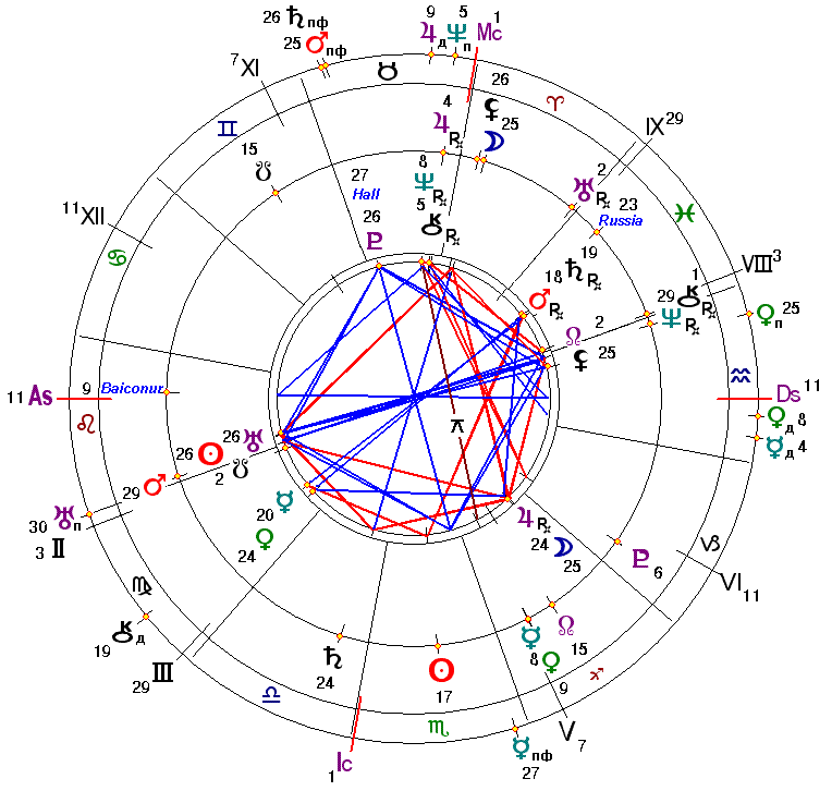На рис. 10 приведена карта независимости России от 12.06.1990 г. с положениями транзитных планет с индексом «т», прогрессивных — с индексом «п», дирекционных — с индексом «д», профекционных — с индексом «пф» на момент запуска КА «Марс-96».
