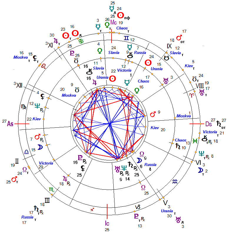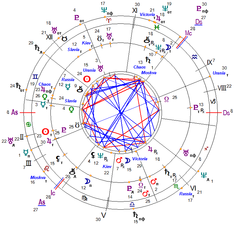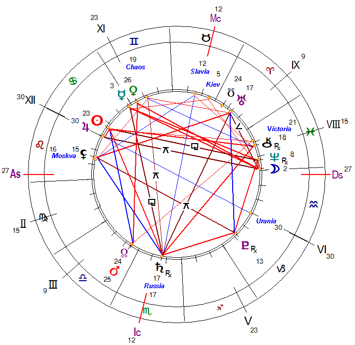 Эта конфигурация говорит о том, что авария в метро по пути следования от станции «Киевская» (астероиды Kiev) до станции «Славянский бульвар» через станцию «Парк Победы» (астероид Victoria), свидетельствующая о какой-то неразберихе (астероид Chaos) в Московском метрополитене, затронула руководство России (ее Солнце) и заставляет его принимать какие-то решения (Меркурий) о задачах государства (МС) с учетом императивности (Солнце профекционное) ситуации, реакции на нее социума (Венера) и тяжелого воздействия на общественность (Сатурн, 7 Дом) [и как тут не провести параллель с ситуацией в 2014 году в Киеве, Украине, Крыму, юго-востоке Украины и в России, поскольку такие развороты в карте России сложились именно в 2014 году!?].