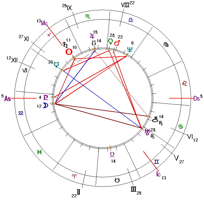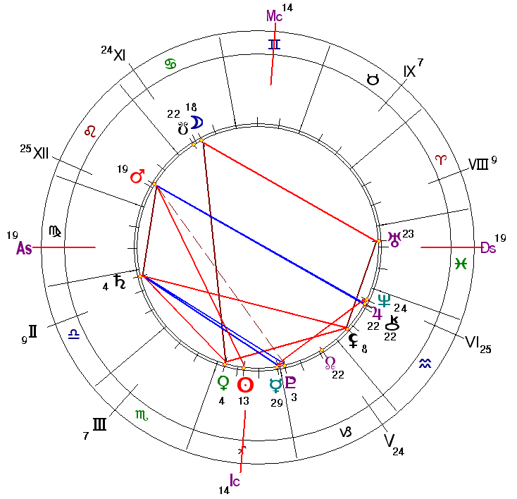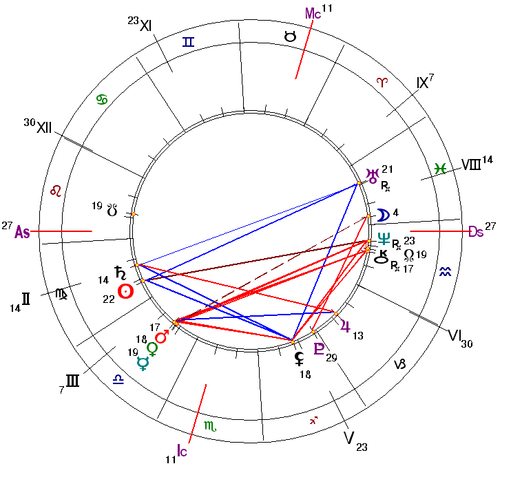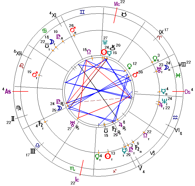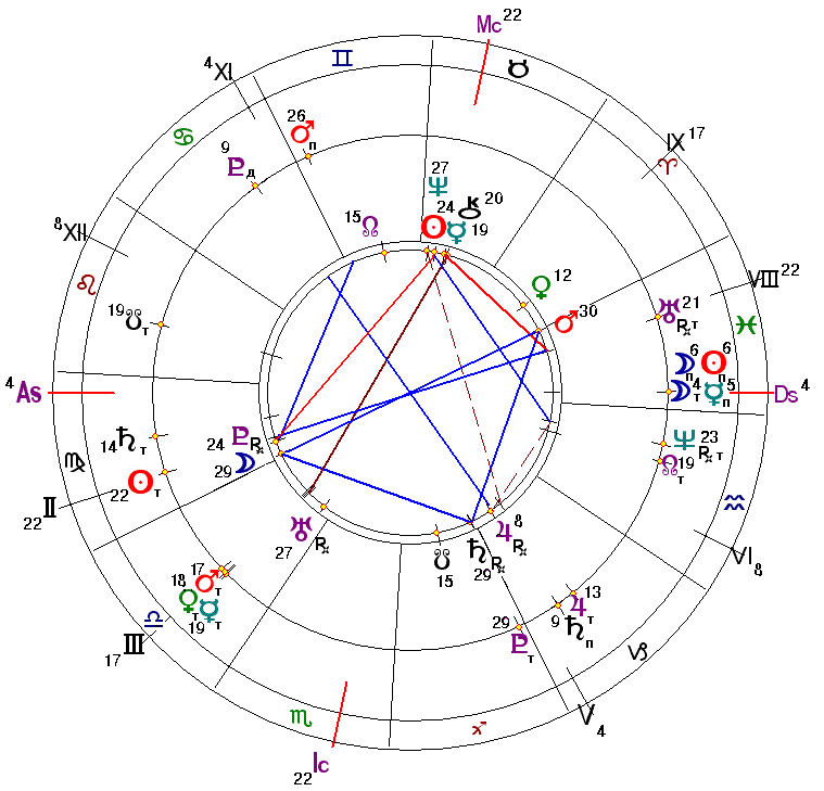 Обращает на себя внимание и скопление планет рядом с Десцендентом в 3°33 Рыб — это транзитная и прогрессивная Луна, прогрессивные Меркурий и Марс в 4°-6° Рыб.