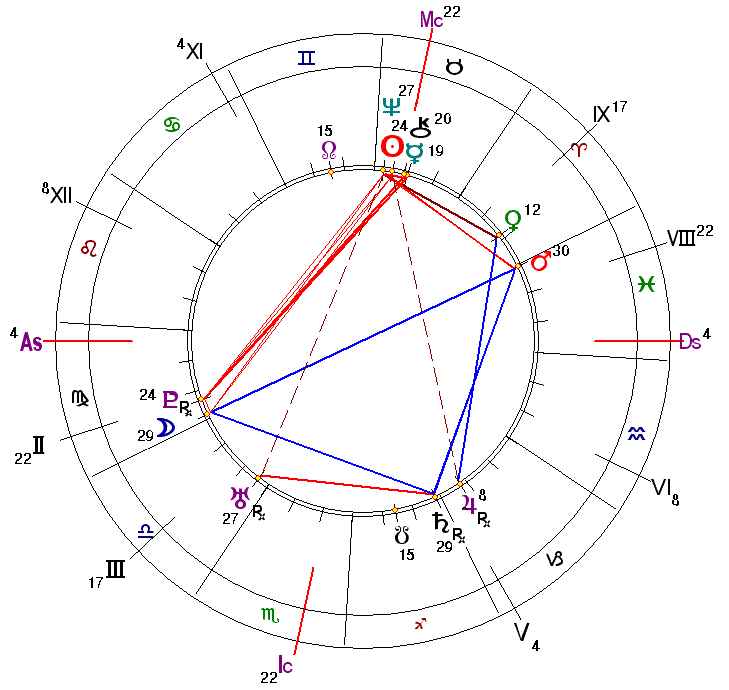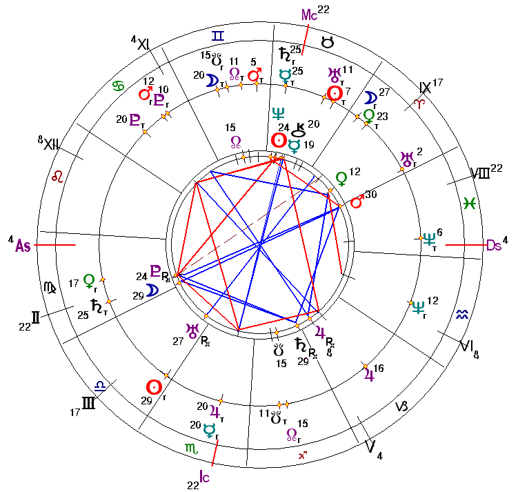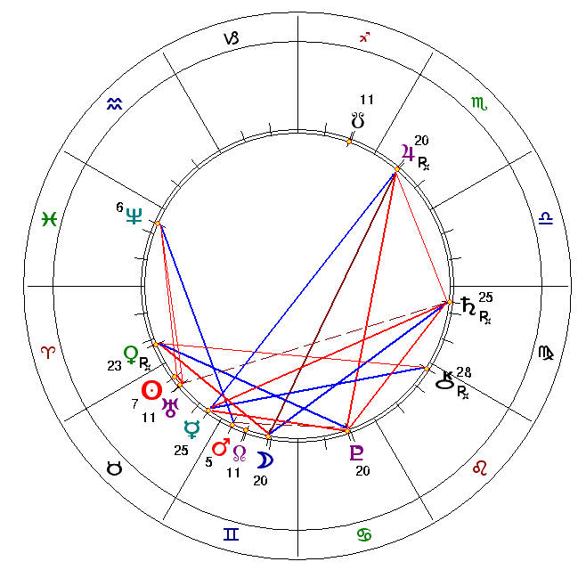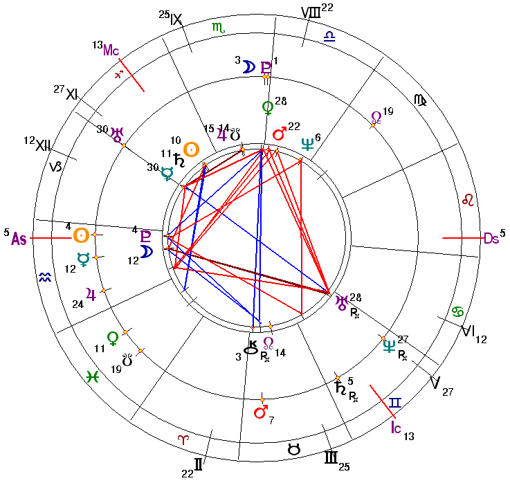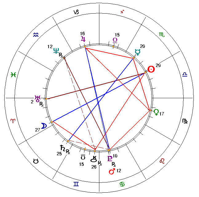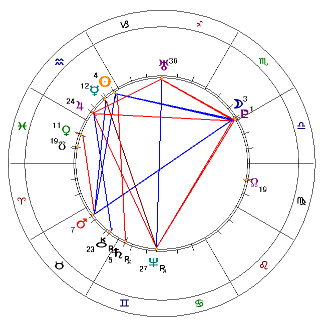 Управители 8 Дома в Рыбах и Овне — Нептун с Юпитером и Марс с Плутоном — вновь имеют ряд неблагоприятных аспектов. Так, транзитные Юпитер и Нептун в 21°29 и 23°57 Водолея в 6 Доме работы и здоровья образуют квадрат к натальным Нептуну, Солнцу и Меркурию в 26°48, 23°49 и 18°40 Тельца в 10 Доме властей и 9 Доме дальних путешествий, а также оппозицию к транзитному Марсу в 18°10 Льва в 12 Доме. В результате эти планеты образуют еще один Тау-квадрат натальными Солнцем и Меркурием на острие этой конфигурации.