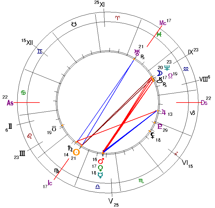 Управители 8 Дома в Рыбах и Овне — Нептун с Юпитером и Марс с Плутоном — имеют ряд неблагоприятных аспектов. Так, транзитный Нептун в 22°06 Водолея в 6 Доме образует квадрат к натальным Нептуну, Солнцу и Меркурию в 26°48, 23°49 и 18°40 Тельца в 10 Доме властей и 9 Доме дальних путешествий. Натальный Юпитер в 7°40 Козерога в 5 Доме оказался в точном соединении с прогрессивным Сатурном в 8°25 Козерога и в оппозиции с дирекционным Плутоном в 8°39 Рака в 11 Доме. Дополнительно к перечисленным неблагоприятным аспектам Марса и Плутона прогрессивный Марс в 25°01 Близнецов в 10 Доме оказался в квадрате с натальным Плутоном в 23°19 Девы в 1 Доме.
