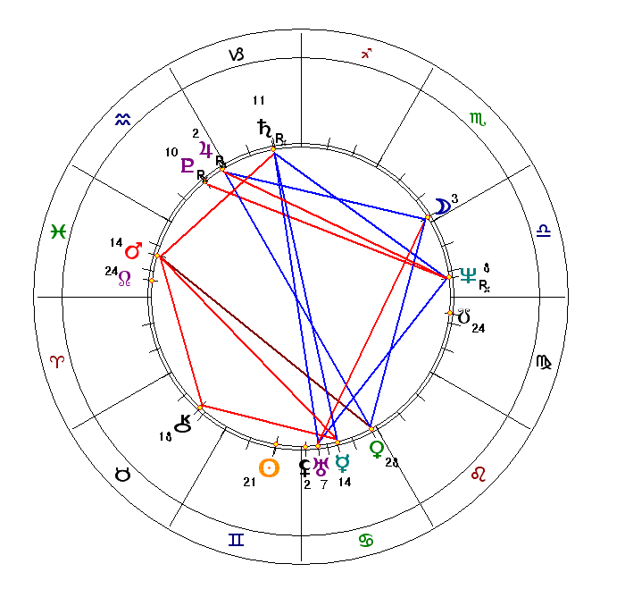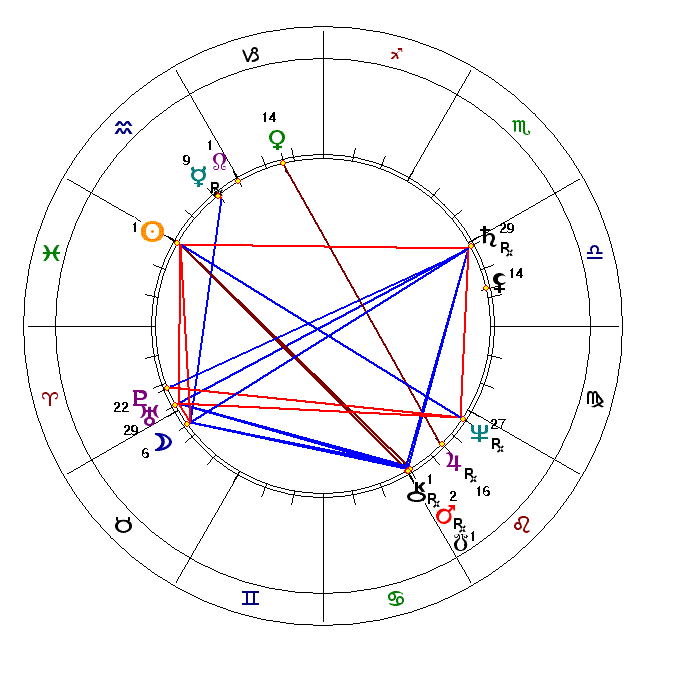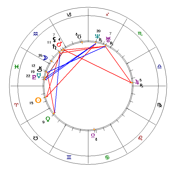 В этой космограмме Нептун в 19°53 огненного знака Стрельца находится в квадрате с Плутоном и Меркурием в 21°56 и 18°38 Рыб, Уран в 6°41 Стрельца — в квадрате с Хироном в 11°39 Рыб, в секстиле с Марсом, Черной Луной и Сатурном в 3°49, 6°16 и 10°32 Водолея и в секстиле с Юпитером в 4°05 Весов. В этих аспектах Юпитер увеличивает масштабы уранических проявлений в извержении вулкана, Марс активизирует Уран, а Сатурн облегчает Урану разрушение земных пород, составляющих вулкан.
