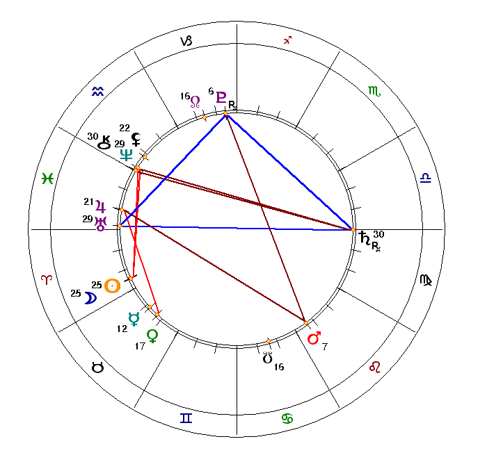 Из рис. 1 видно, что Сатурн в 28°24 Весов находится в точной оппозиции с Ураном и в широкой оппозиции с Плутоном в 28°05 и 21°40 огненного Овна. В этой конфигурации Сатурн связан с горами, Плутон — с вулканом, Уран — с выбросами из жерла вулкана пепла, камней, взрывами, Овен — с расплавленной лавой. При этом в другом огненном знаке находятся Хирон, Южный Узел Луны, Марс, Юпитер и Нептун в 0°05, 0°15, 1°17, 15°07 и 26°31 Льва. Все вместе они соотносятся с необычным (Хирон) действием (Марс) и с обилием (Юпитером) жидкого (Нептун) огня (Лев), которое берет свое начало в далеком прошлом (Южный Узел Луны).