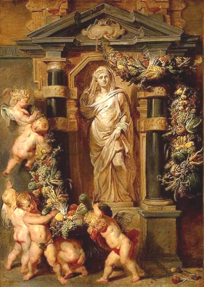 Что еще происходило в жизни Рубенса в этот двухлетний период, ознаменованный соединением дирекционного Юпитера с Асцендентом? Так спрашивала я себя, ища ответ в его биографиях. Этим временем, 1614-15 годами, датированы две его картины о Церере — «Статуя Цереры» и «Церера и Пан». Оказалось, что в это время на натальной Церере Рубенса был его дирекционный Асцендент! А дирекционная Церера была тогда на Луне! В картине «Статуя Цереры» (1615) главным предметом изображения является античный памятник — эллинистическая статуя богини растительности и земного плодородия, которую Рубенс мог видеть в собрании Боргезе в Риме. В картине художник поместил скульптуру в архитектурную нишу и окружил ее фигурами малышей, вероятно, согласно соединению Цереры с Луной, связанной с детьми, а также согласно одновременному соединению дирекционной Луны со Жребием Детей. Эта ниша в точности воспроизводит арку декоративной стены, воздвигнутой по собственному проекту Рубенса между двором и садом в его доме.