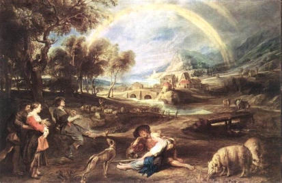 О стремлении Весов к гармонии. ось Узлов Овидия, на которой у него Меркурий, находится в точном соединении с Асцендентом и осью Узлов Рубенса! Стремление к гармонии и равновесию отражено в «Пейзаже с радугой», относящемся к первой половине 1630-х годов, идиллическому настроению отдыхающих после трудового дня пастухов вторит безмятежный покой окружающей их природы. Но выраженная в нем идея о гармоничном единстве человека и мира воспринимается лишь как прекрасная мечта, которая так же эфемерна и призрачна, как и явление радуги на небе. И все же, эта картина является зримым воплощением этой желанной мечты, и выражает чувство восторга художника, продолжающего петь гимн немеркнущей красоте жизни...