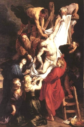 «Снятие с креста» (1612-14 гг.) — центральная часть триптиха, созданного Рубенсом для главного городского собора Антверпена. Картина являет собой один из наиболее выразительных образов Иисуса Христа. Для его современников это был не только триумф цвета, формы и композиции; она с неотразимым красноречием трактовала главную тему всей их веры. Всего лишь через несколько лет после написания слава о «Снятии с креста» облетела всю Европу, и именно эта картина сделала Рубенса первым по величине религиозным художником своего времени. В ней впервые нашёл свое полное отражение эмоциональный накал стиля барокко.