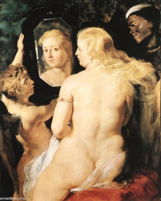Более того, облик Елены Фоурмен, все ее многочисленные портреты, напоминают тот идеал лучезарной, солнечно-светлой, пышной, красавицы с золотыми волосами (!) с красивым разрезом больших блестящих глаз, который согласно расположению Венеры в знаке, управляемым Солнцем, присутствовал в произведениях мастера всегда, задолго до того, как она вошла в его жизнь. Все портреты Елены Фоурмен напоминают его Венеру перед зеркалом в картине «Утренний туалет Венеры». Этот образ богини красоты и любви был создан Рубенсом в 1613-15 годах, более чем за 15 лет до венчания с Еленой. Тогда, этот образ возлюбленной был создан в соответствии с соединением дирекционной Венеры со Жребием Любви и одновременного включения натальной Венеры, управителя Асцендента, оппозицией дирекционного Сатурна. Именно тогда Рубенс пришел к осознанию своего образа любимой, а Сатурн сконцентрировал внимание художника на этом его образе. Оппозиция Сатурна к Венере во Льве четко отразилась во всех деталях картины, где солнечная, лучезарная богиня красоты с золотыми, как солнечные лучи волосами, согласно расположению натальной Венеры Рубенса во Льве, смотрит на свое отражение в зеркале с черной раме, цвета Сатурна, и противопоставлена по контрасту с темнокожей служанкой и темным фоном картины, связанным с символизмом Сатурна и усиливающим яркость, светлость, солнечность Венеры в знаке, управляемым Солнцем.