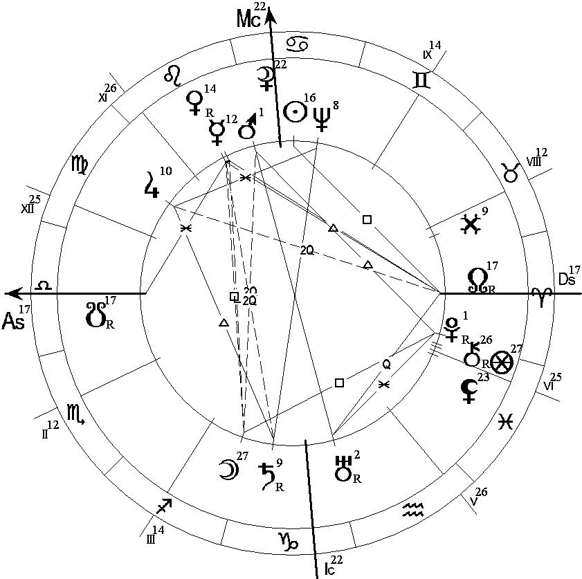 Соединение дирекционной Луны, связанной с эмоциями, с оппозицией Уран-Марс во время создания этой картины в карте Рубенса точно соответствует эмоциональному (Луна) накалу (Марс-Уран) этой картины. Одновременно дирекционный Плутон был на Жребии Духа, Жребий Духа — в квадрате к Юпитеру и в оппозиции к Жребию Славы. Жребий Оккультизма и Черная Луна были на Жребии Судьбы, Сатурн-Нептун — в квадрате к куспиду 8 Дома, а куспид 8 Дома — в полуквадрате к Марсу-Урану.