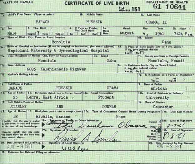 Барак Хусейн Обама младший (Barack Hussein Obama II) родился 4 августа 1961 г. в Гонолулу, штат Гавайи, США. Его родители познакомились в 1960 году во время учёбы в Гавайском университете в Маноа. В ходе предвыборной кампании в США циркулировали слухи о том, что Обама был рождён за пределами США, что лишало бы его права избираться на пост президента. 1 марта 2012 года аризонский шериф Джо Арпайо объявил, что свидетельство о рождении Барака Обамы может являться подделкой, выполненной на компьютере; аналогичное заявление он сделал в отношении формы учета военнообязанного, заполненной будущим президентом в 1980 году.