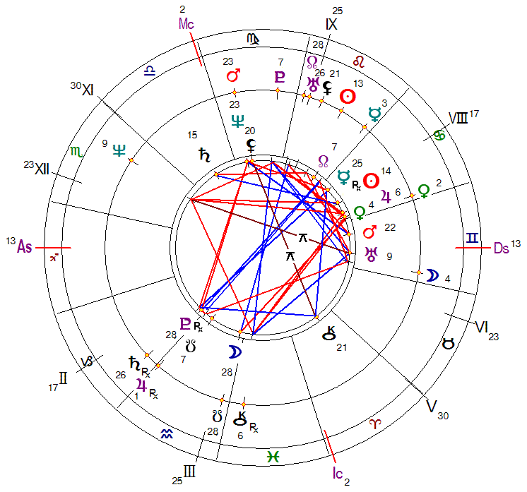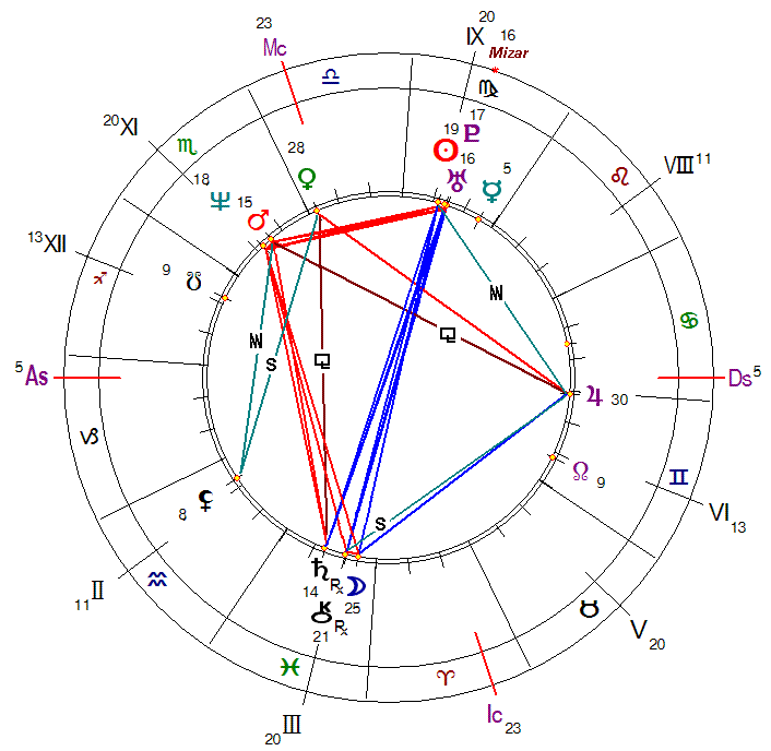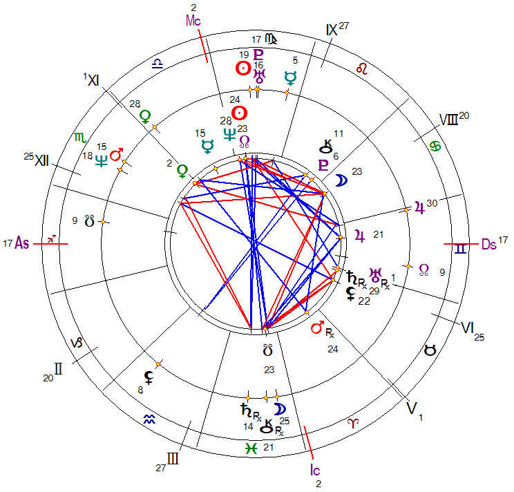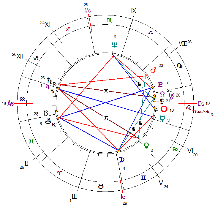 Главной в этой карте является оппозиция Урана (неожиданности, изобретательность, взрывчатость), Плутона (рок, диктат, давление, глубинная психология, управление массами, спецслужбы, оружие массового поражения) и Солнца (воля, инициативы, лидерские качества, власть, яркий отец) в 15°27, 16°11 и 18°31 рациональной Девы в конце 8 Дома чужих финансов, политики, психологических стрессов, хирургии, катастроф, смерти и вблизи куспида 9 Дома мировоззрения, идеалов, веры, морали, высшего образования и дальних стран в 19°13 Девы с Сатурном (ограничения, трудности, строгий отец) и Хироном (странности, двойственности, целительство) в 13°27 и 20°19 размытых и сострадательных Рыб на границе 2 Дома собственных ценностей и 3 Дома коммуникации, близкого окружения, коротких поездок в 19°13 Рыб.