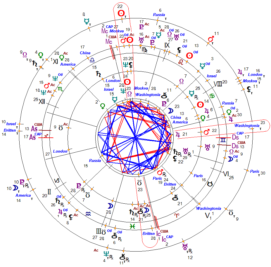 Вновь отметим на этой карте самые важные — военно-опасные аспекты и конфигурации, оставляя иные читателям для самостоятельного рассмотрения. Такой архиважной аспектной конфигурацией является Тау-квадрат, созданный: а) транзитным Солнцем (воля, инициативы, императивные обстоятельства, «спусковой крючок») в 21°24 Девы, Плутоном (рок, тотальный диктат, спецслужбы, оружие массового поражения) и Солнцем (воля, инициативы, власть) Асада, Марсом (активность, агрессивность, военные конфликты) Обамы в 16°11, 18°31 и 22°35 Девы, Черной Луной (соблазны, темные дела) и Нептуном (тайны, секреты, иллюзии, нефть, газ, обман и самообман, манипуляции и махинации) США в 19°28 и 22°25 Девы, Северным Узлом Луны (текущие задачи) и Солнцем (воля, инициативы, лидер, власти) Сирии 22°46 и 23°08 Девы в 9 Доме веры, идеалов, мировоззрения, дальних стран для САР и США; б) Хироном (странности, двойственности) и Луной (эмоции, отношение к простым людям) Асада в 20°19 и 24°14 Рыб в 3 Доме коммуникации и СМИ; в) Юпитером (вера, мораль, религиозные конфликты, большие деньги, везение) Сирии и Марсом (агрессивность, конфликты, войны) США, транзитным астероидом Washingtonia (Вашингтон) в 20°31, 21°23 и 22°03 Близнецов в 7 Доме явных врагов как Сирии, так и США.
