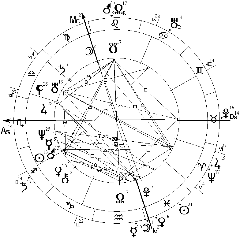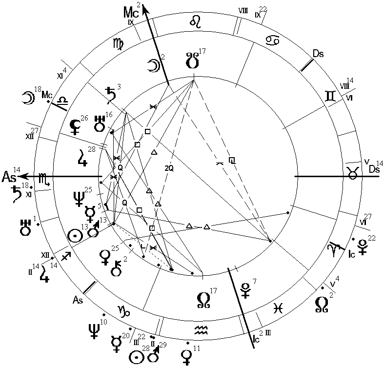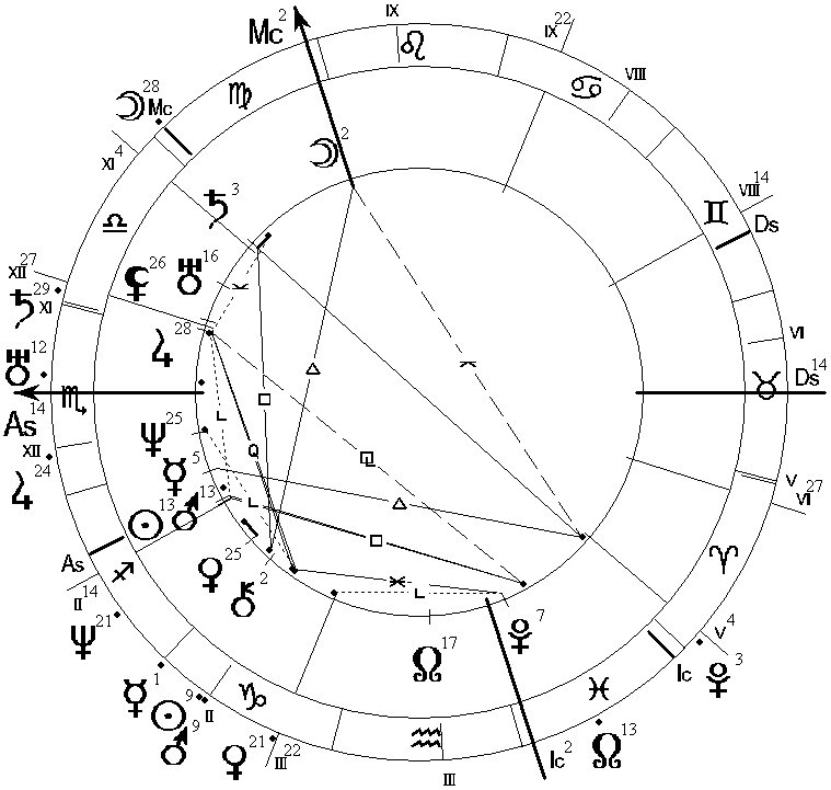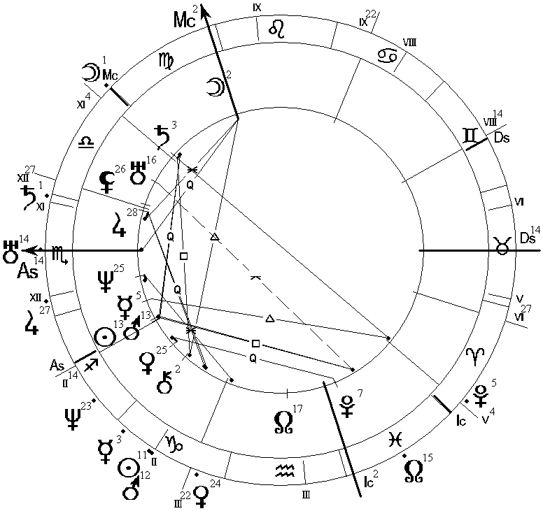 Рис. 5. Гороскоп Ф.И. Тютчева, род. 05.12.1803, GMT = 2:59, и дирекционнная карта на 14.06.1832, GMT = 12:00,